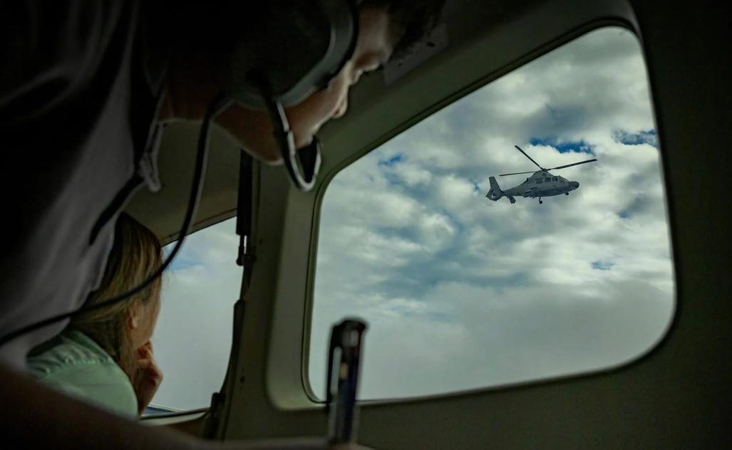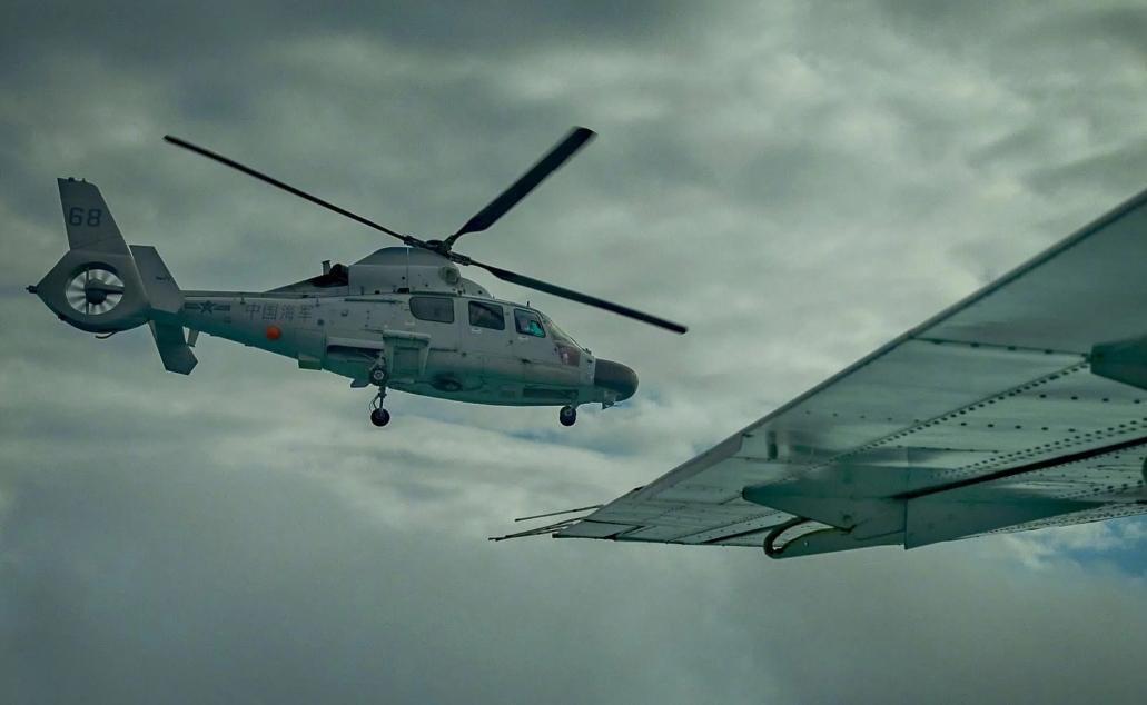 如同一场高空巅峰对决,中方迅速派出直-9F舰载直升机予以拦截。在视频中可以看到,中方直升机贴近菲方巡逻机,以近乎压迫性的飞行姿态表达了“这片天你过不去”的坚定立场。这场面让菲方机舱内的气氛瞬间紧张,菲方记者惊呼连连,飞行员也被迫通过无线电喊话:“飞得太近了,这非常危险。”